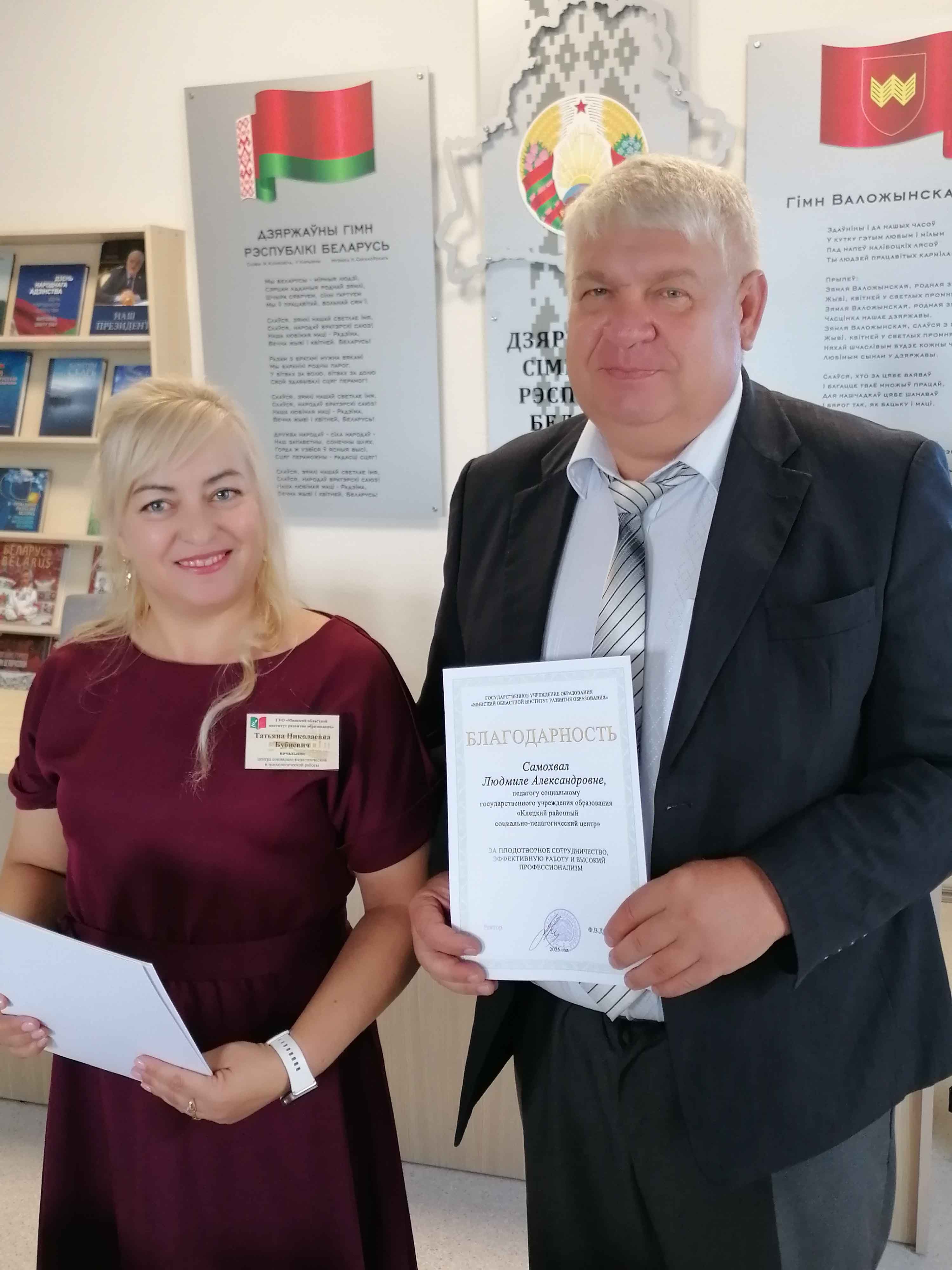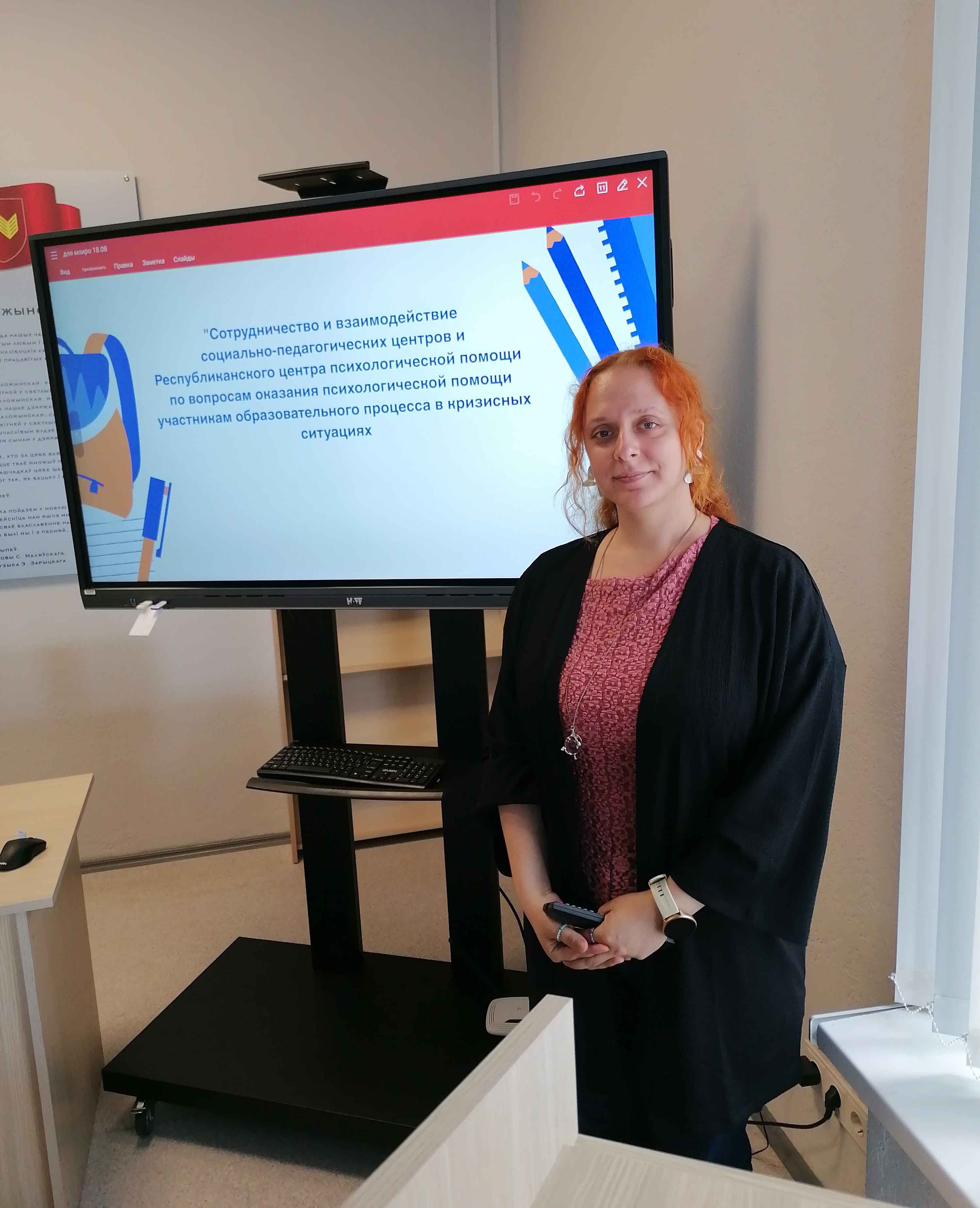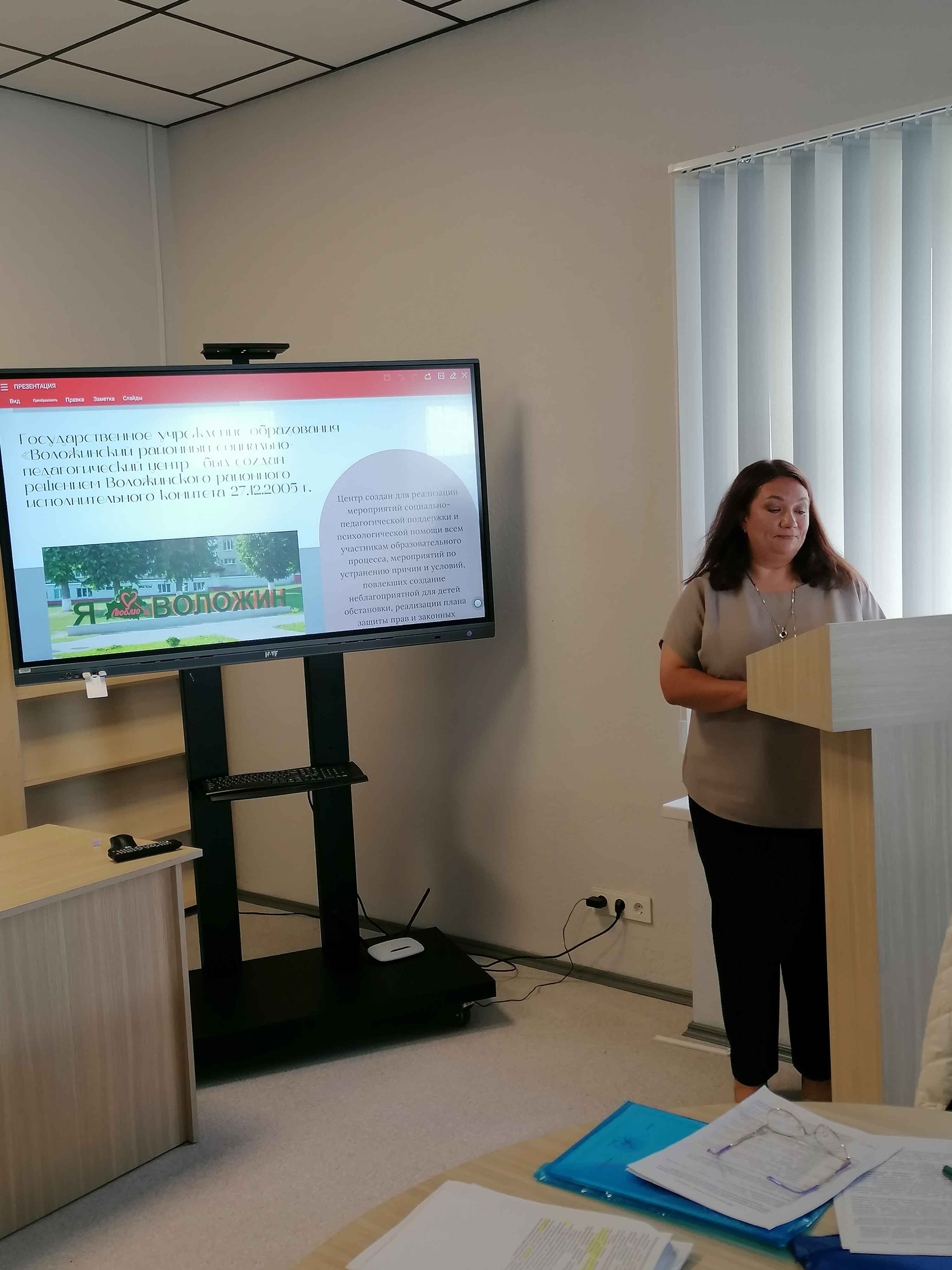 Нахай Елена Юрьевна, директор Воложинского районного социально-педагогического центра, представила участникам опыт работы центра по координации деятельности специалистов учреждений образования Воложинского района, направленной на оказание социально-педагогической поддержки и психологической помощи участникам образовательного процесса.
