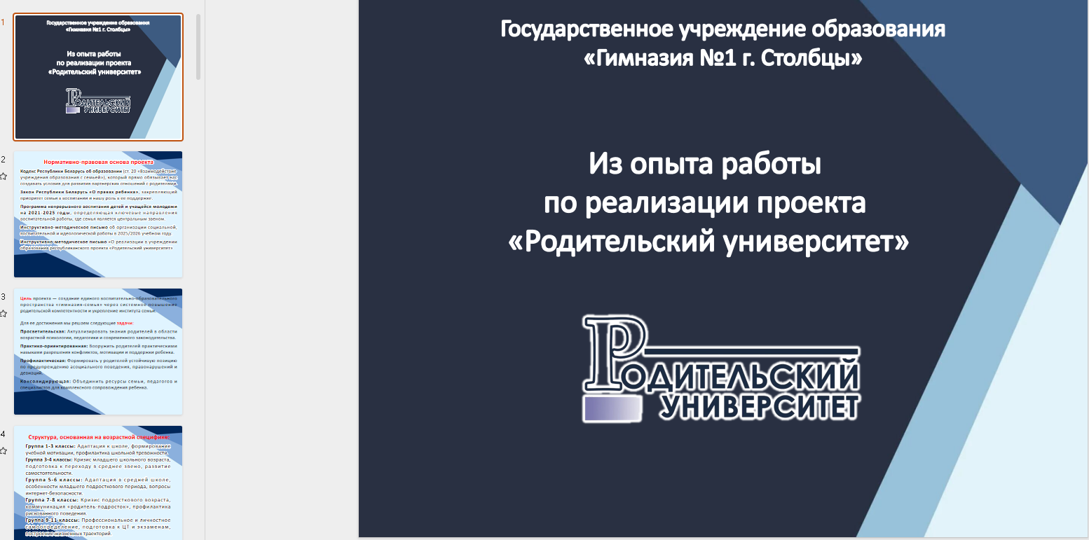 Из опыта работы государственного учреждения образования «Гимназия №1 г.Столбцы» по реализации проекта «Родительский университет» (Андриенко Светлана Антоновна, заместитель директора по воспитательной работе ГУО «Гимназия №1 г.Столбцы»);
