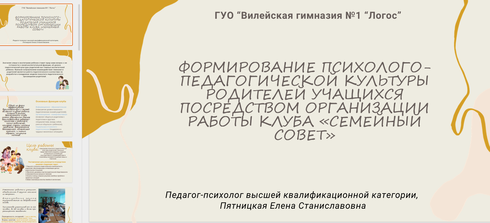 «Повышение психолого-педагогической культуры родителей через реализацию мероприятий клуба “Семейный совет”» (Пятницкая Елена Станиславовна, педагог-психолог ГУО «Вилейская гимназия №1 «Логос»);