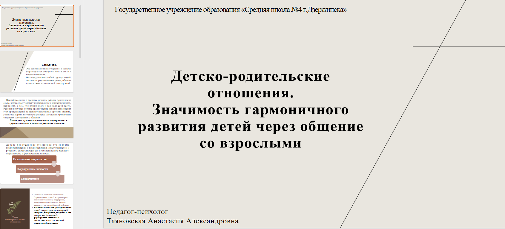 «Детско-родительские отношения. Значимость гармоничного личностного развития детей через общение со взрослыми» (Таяновская Анастасия Александровна, педагог-психолог ГУО «Средняя школа №4 г. Дзержинска»).