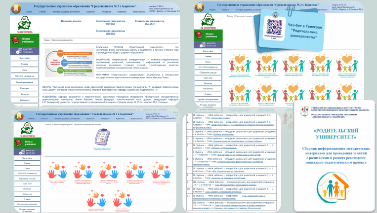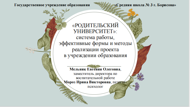 «“Родительский университет”: система работы, эффективные формы и методы реализации проекта в учреждении образования» (Мельник Евгения Олеговна, заместитель директора по воспитательной работе ГУО «Средняя школа № 3 г.Борисова», Мороз Ирина Викторовна, педагог-психолог ГУО «Средняя школа № 3 г.Борисова»);