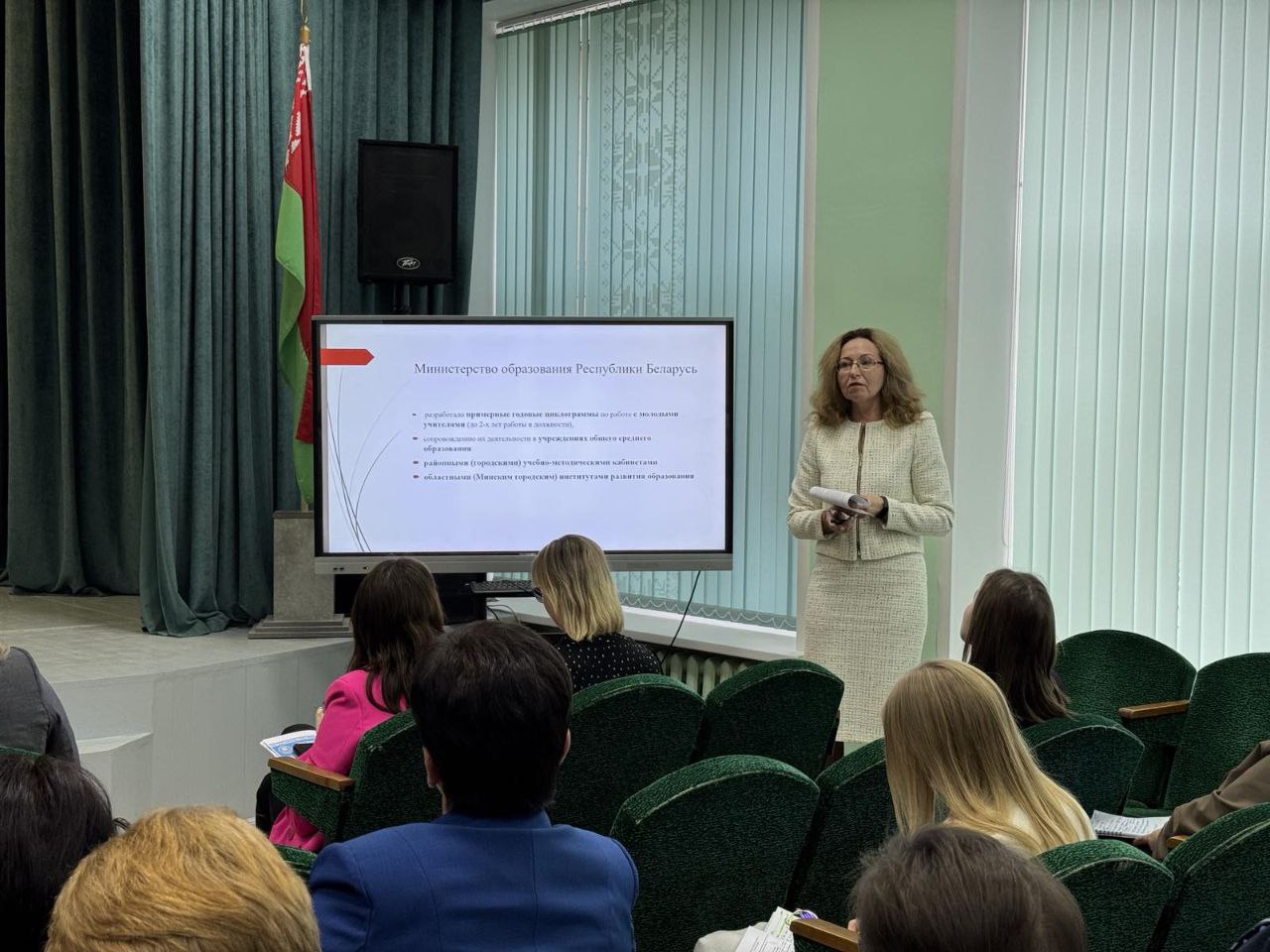 Шеруенова Мария Дмитриевна, начальник управления аналитической работы и менеджмента ГУО «Минский областной институт развития образования», познакомила с особенностями организации сопровождения деятельности молодых учителей в учреждении общего среднего образования;